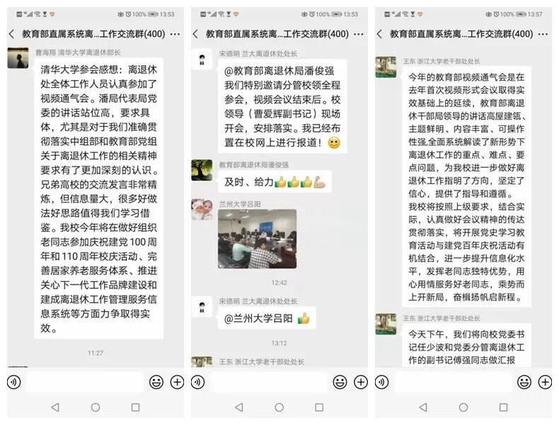 中国人民大学离退休党委书记、离退休工作处处长纪红波,浙江大学党委组织部副部长、离休党工委书记、离退休工作处处长王东,陕西师范大学离退休党委书记、离退休职工工作处处长刘瑜,兰州大学离退休工作处处长宋德明,国家开放大学离退休工作处处长谢盛勇围绕组织老同志庆祝建党100周年和推进信息化建设交流了有关做法。中国人民大学确定的“与党同呼吸、共命运”主题,方案考虑全面细致,队伍配备保障有力,目标设定注重实效;浙江大学围绕六个篇章策划的“银龄共庆”活动,内容丰富、载体多样、保障到位;陕西师范大学布好“一盘棋”、学好“一部史”、上好“一堂课”、建好“一个家”,思路新、举措实;兰州大学离退休信息化平台建设效率高、进展快、成效好,工作体会深刻感人;国家开放大学领导高度重视,注重部门协调,老少结合紧密,系列活动丰富。