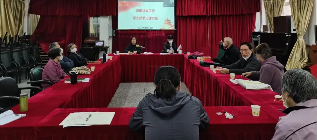 2023年1月12日上午,离退休党工委召开2022年度党支部书记述职会。根据疫情防控要求和离退休党支部书记、委员居住分散的实际情况,此次会议在南校园方润华楼101室、腾讯会议线上线下同时召开。离退休党工委全体委员、各党支部书记和委员、全体在职党员近20人参加了会议。会议由党工委纪检委员朱雪梅主持。